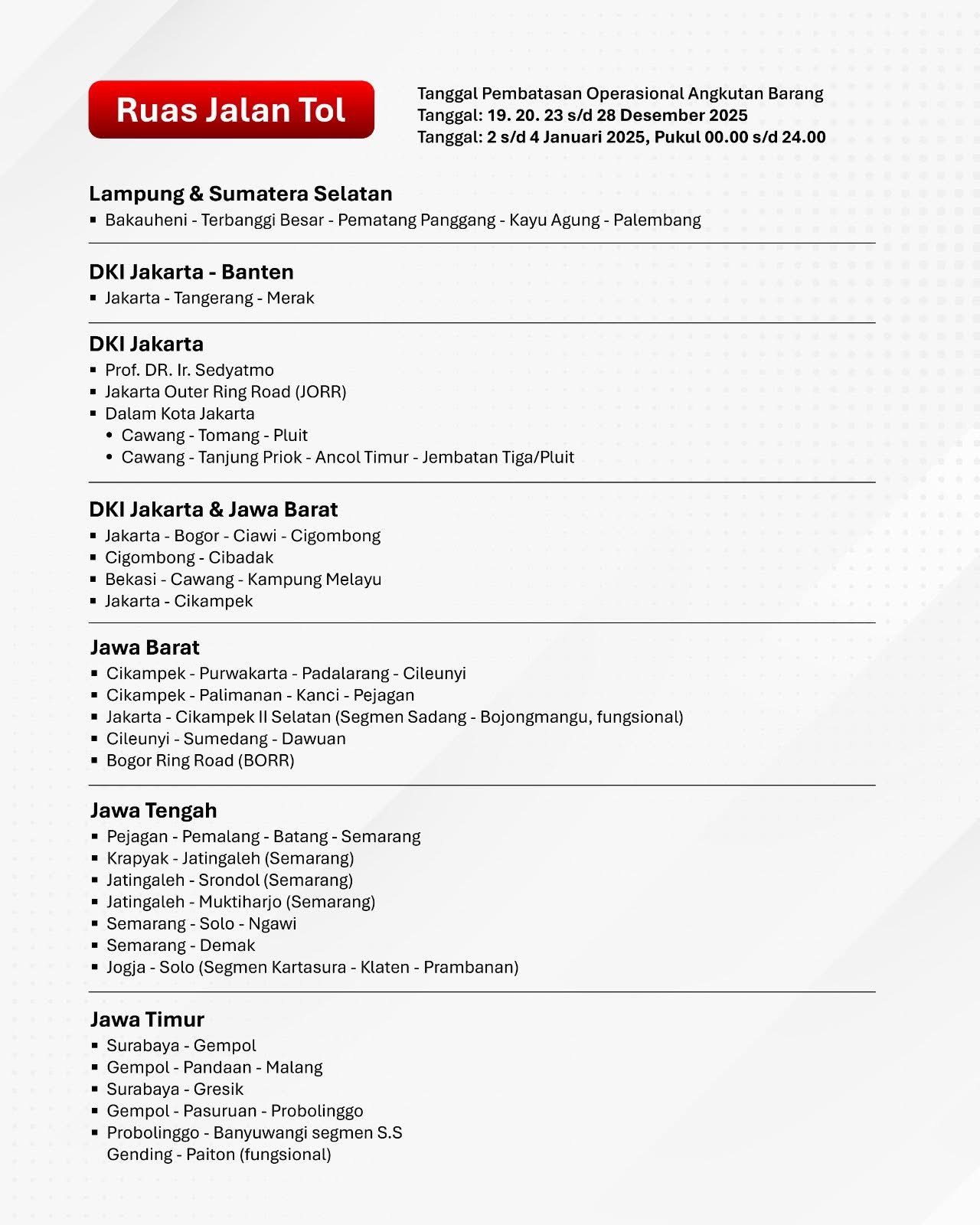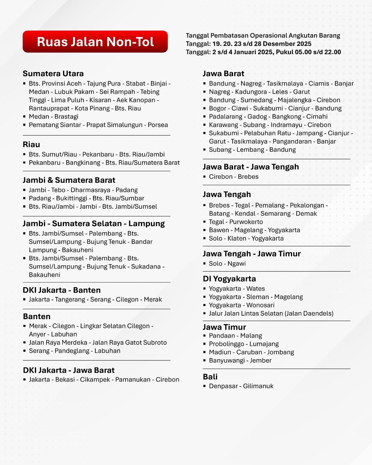 Dalam rangka mendukung kelancaran arus lalu lintas dan meningkatkan keselamatan perjalanan selama periode Natal 2025 dan Tahun Baru 2026, pemerintah melalui Kementerian Perhubungan memberlakukan pembatasan operasional kendaraan angkutan barang di sejumlah ruas jalan utama.